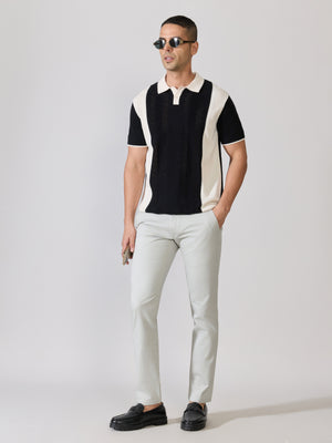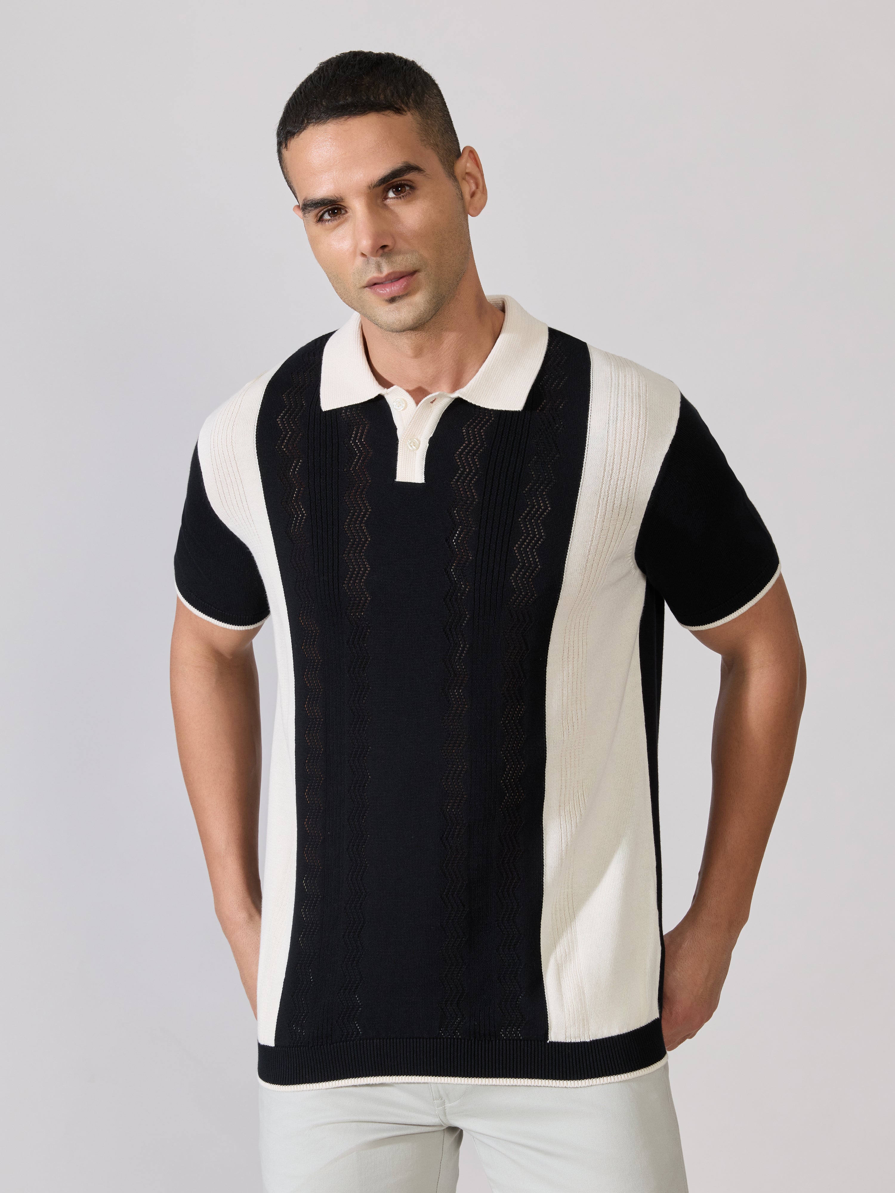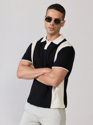Kikeos-1 - Regular Fit Textured Knit Polo T-Shirt - Black & Cream