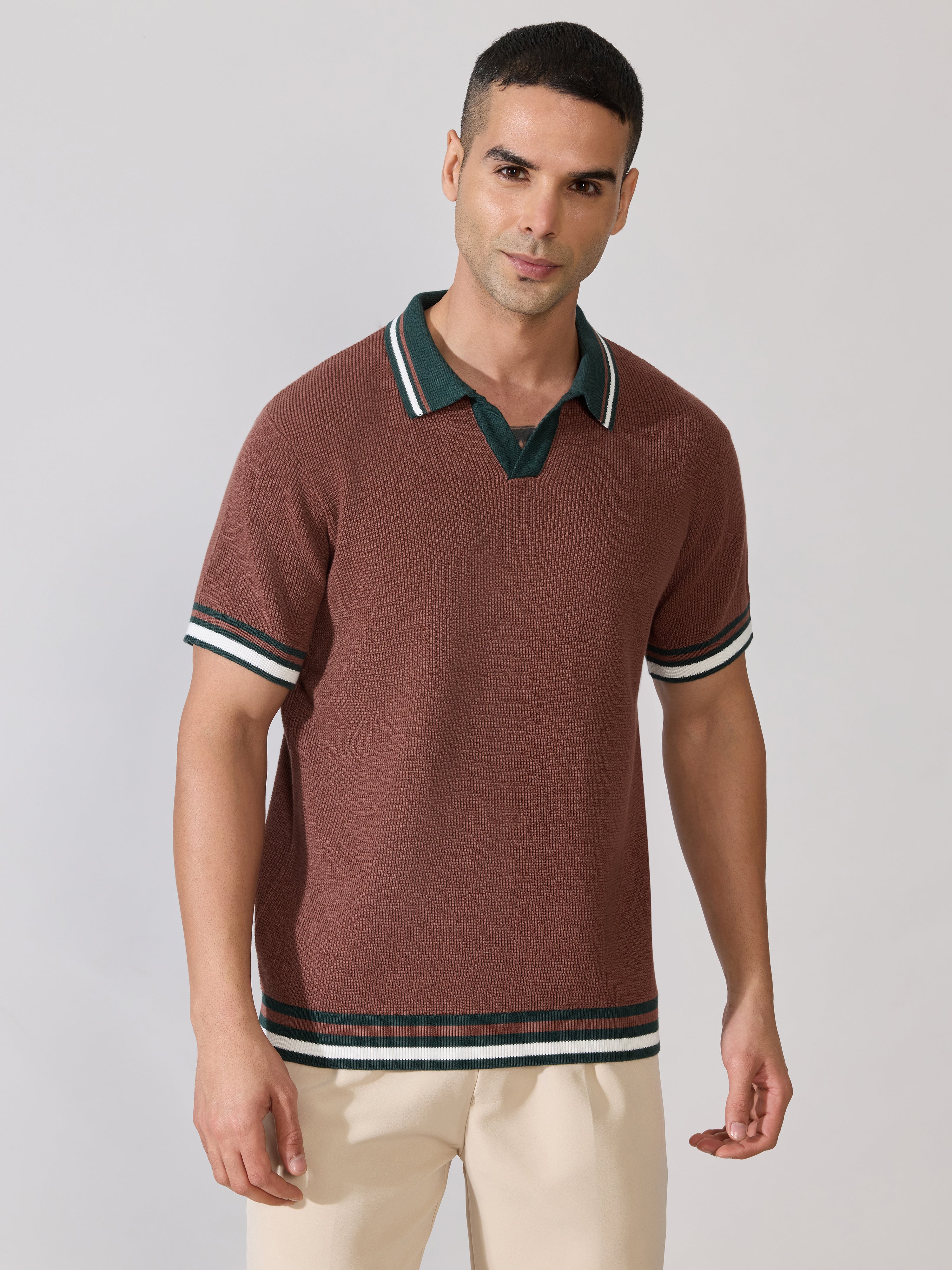 Kikeos-4 - Regular Fit Contrast Collar Knit Polo T-Shirt - Root Beer
