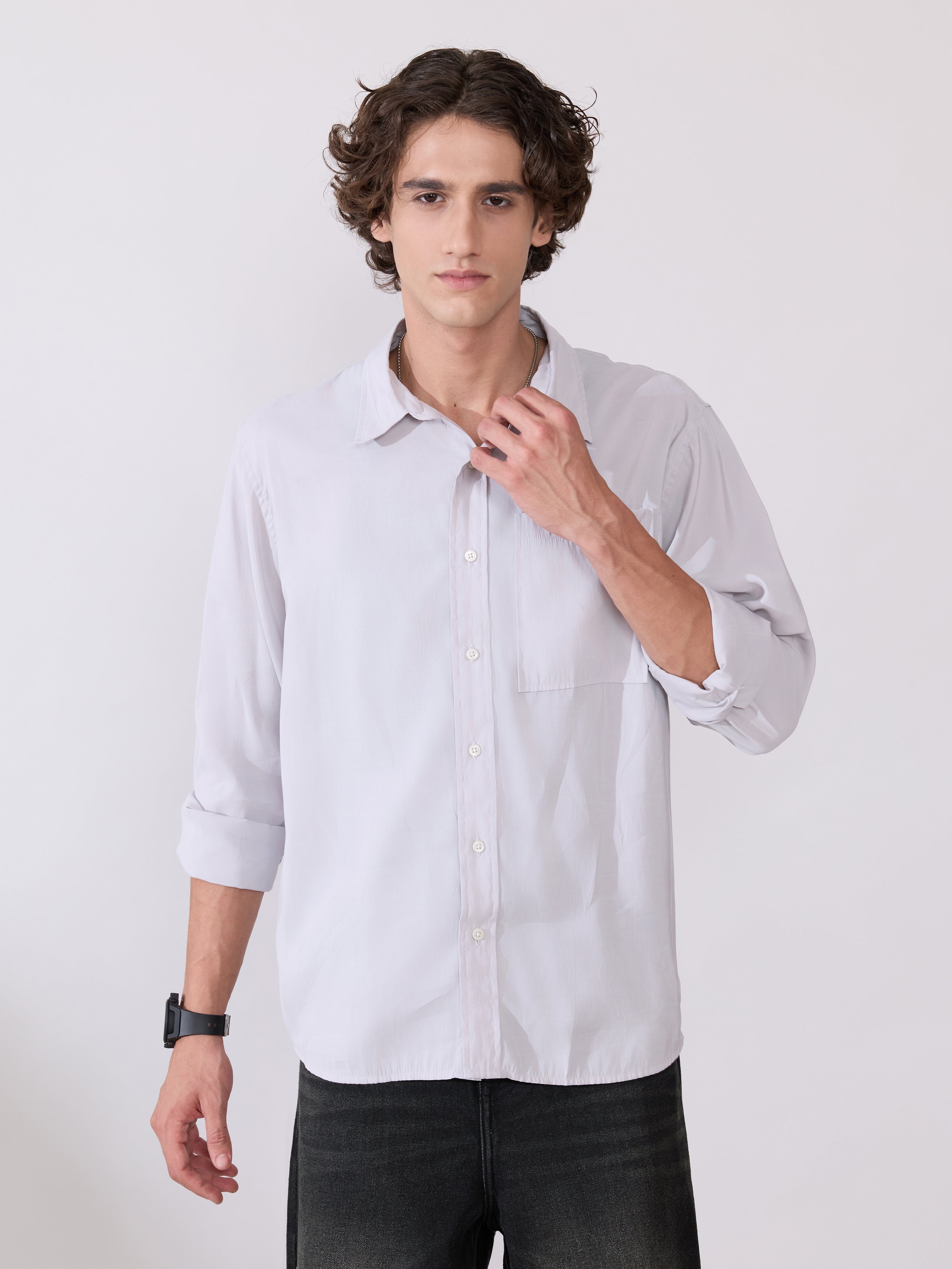 Tailored in an elegant modal-polyester blend, this Auzo - Nimbus Cloud shirt delivers a refined drape and exceptional softness. Its smooth texture, crisp structure, and timeless regular fit create a polished look suitable for elevated everyday wear. Lightweight yet luxurious, it’s crafted for those who appreciate understated sophistication and premium comfort in every wear.